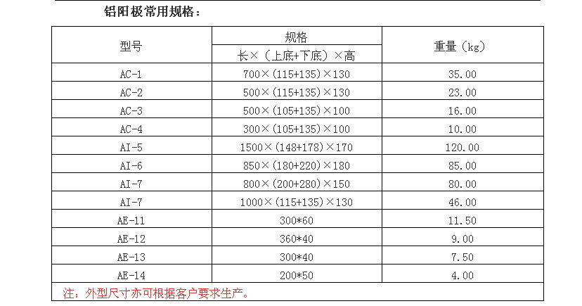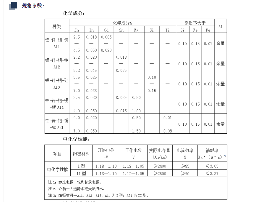 產品概況主要特點  電化學性能優良:電極電位較負,能提供持續穩定的電流輸出,可有效保護儲罐內壁金屬免受腐蝕,在含氯離子的電解質環境中性能表現更佳。發電量大:單位重量的陽極材料發電量大,約為鋅陽極的 3 倍,鎂陽極的 2 倍,能在較小的體積和重量下提供足夠的保護電流。自調節能力強:可根據儲罐內環境變化自動調節電流大小,適應不同的腐蝕狀況和介質條件。消耗均勻:在工作過程中溶解相對較為均勻,能使儲罐內壁得到較為均勻的保護,可預測和計劃更換時間。常見類型Al-Zn-In 系陽極:是儲罐內壁常用的鋁合金陽極之一,銦元素的加入可降低鋁合金的陽極極化,提高陽極活性,使其在儲罐內的電解質溶液中能更有效地釋放電流。Al-Zn-Hg 系陽極:汞元素的存在改善了陽極的表面狀態,降低了陽極的極化電阻,提高了電流輸出效率,但由于汞對環境有一定污染,使用時需注意環保要求。我公司生產的鋁合金犧牲陽極采用優良的原材料(鋁陽極原料純度不低于90%)多重質檢工藝(雜質質檢、金相顯微分析、全套化學分析),成熟的生產工藝嚴格的儀器檢驗,陽極鐵芯檢測確保每支陽極符合國標要求,符合客戶定制需求。  該產品具有以下特點:  (1)電位穩定,電流效率高;  (2)重量輕,安裝方便;  (3)理論電容量大、保護鋼結構時具有自動調節保護電位的作用。  陽極分類:  (1)普通鋁合金犧牲陽極;  (2)高 效鋁合金犧牲陽極;  (3)耐高溫鋁合金犧牲陽極;  (4)梯形、圓盤形、鐲式等形狀犧牲陽極。規格參數產品應用使用注意事項陽極選擇:根據儲罐的實際情況和介質條件來選擇合適的陽極材料和規格,確保其能夠滿足儲罐內壁的防腐要求。安裝要求:嚴格按照相關標準和要求進行安裝,確保陽極與儲罐內壁緊密接觸,以形成良好的電流通路。定期維護:定期檢查和維護鋁合金犧牲陽極,包括電位測量、電流效率測試、溶解均勻性觀察等,確保其正常工作和防腐效果。避免污染:陽極表面嚴禁涂漆或污染,在儲罐進行噴砂除銹和內涂層噴涂工作時,要對陽極采取臨時保護措施,防止噴砂除銹影響到陽極的使用,也避免陽極的外表面被油漆污染。